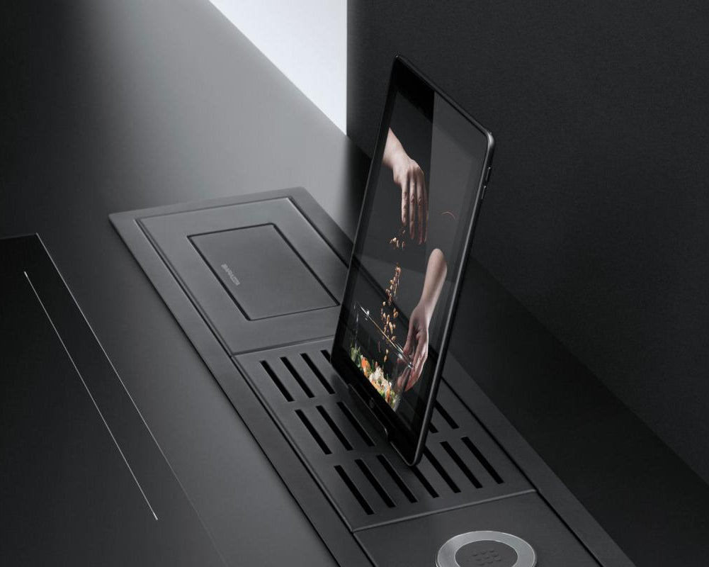 Držač za tablet ili pametni telefon, napravljen od nerđajućeg čelika AISI 304 sa crnom završnom obradom, upotpunjuje funkcionalnost pregrada / posuda za ceđenje čaša i držača za noževe, omogućavajući lako pozicioniranje vašeg mobilnog uređaja.