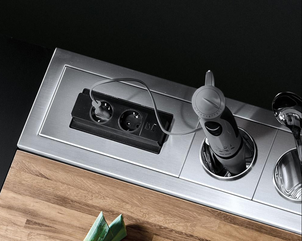 Dostupan u obe završne obrade, obrtni modul za utičnice ima dve Schuko utičnice i USB utičnicu kako bi se omogućilo dostupno povezivanje električnih uređaja na radnoj površini.